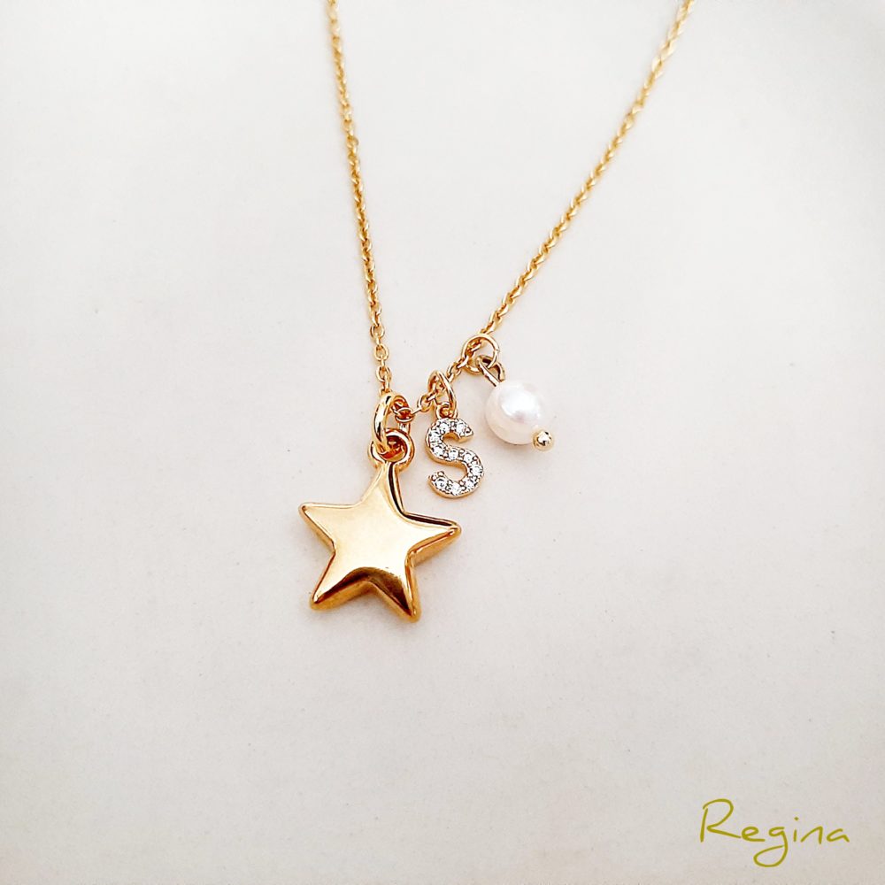 *Medidas aprox.: Cadena de 45cm de largo y 0.2cm de ancho con dije estrella de 2.1×1.4cm, dije letra de 0.8cm y perla de río 0.5cm.