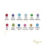 Granate – Enero ,Amatista – Febrero ,Aguamarina – Marzo ,Diamante – Abril ,Esmeralda – Mayo ,Alejandrita – Junio ,Rubí- Julio ,Peridoto – Agosto ,Zafiro – Septiembre ,Turmalina – Octubre ,Topacio – Noviembre ,Circón Azul – Diciembre |