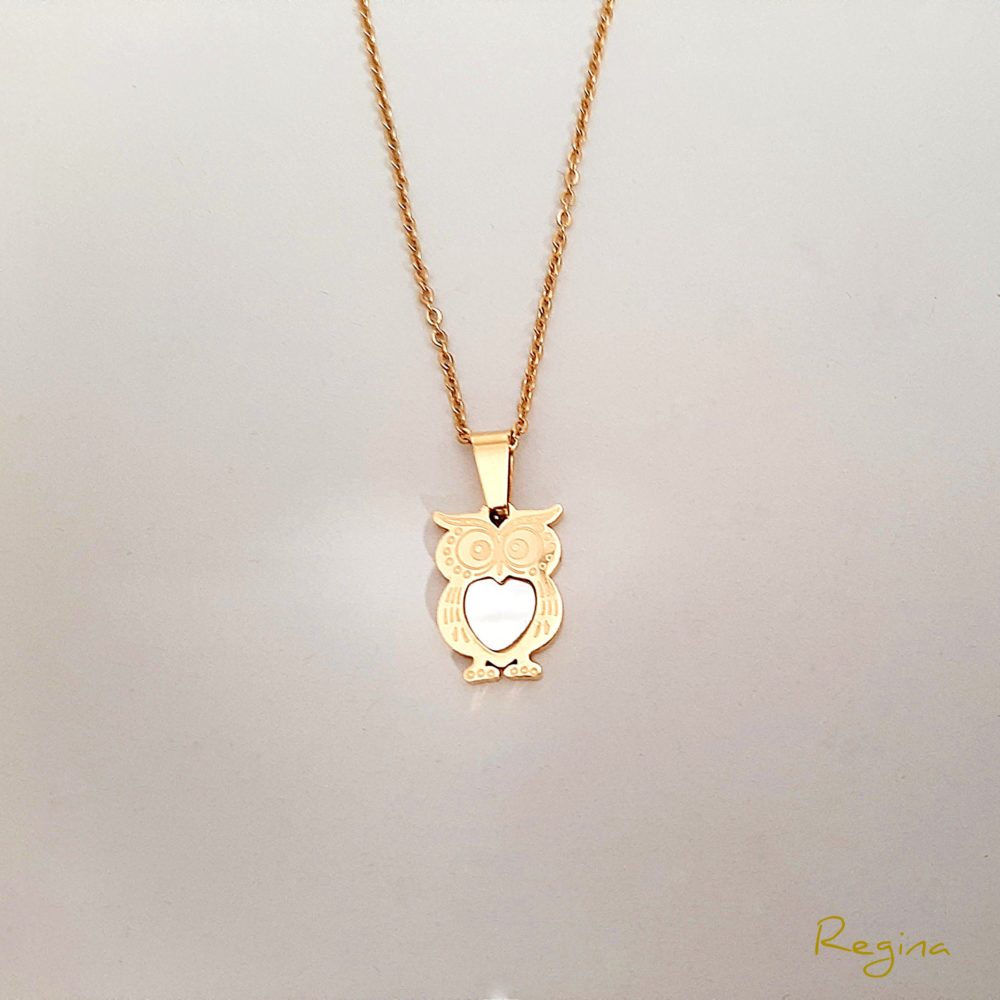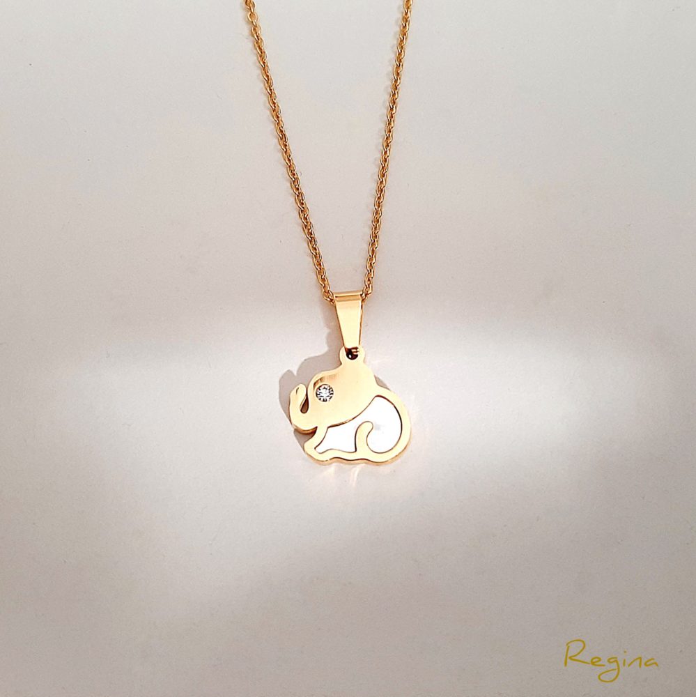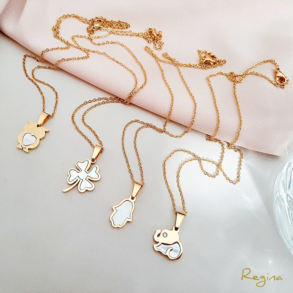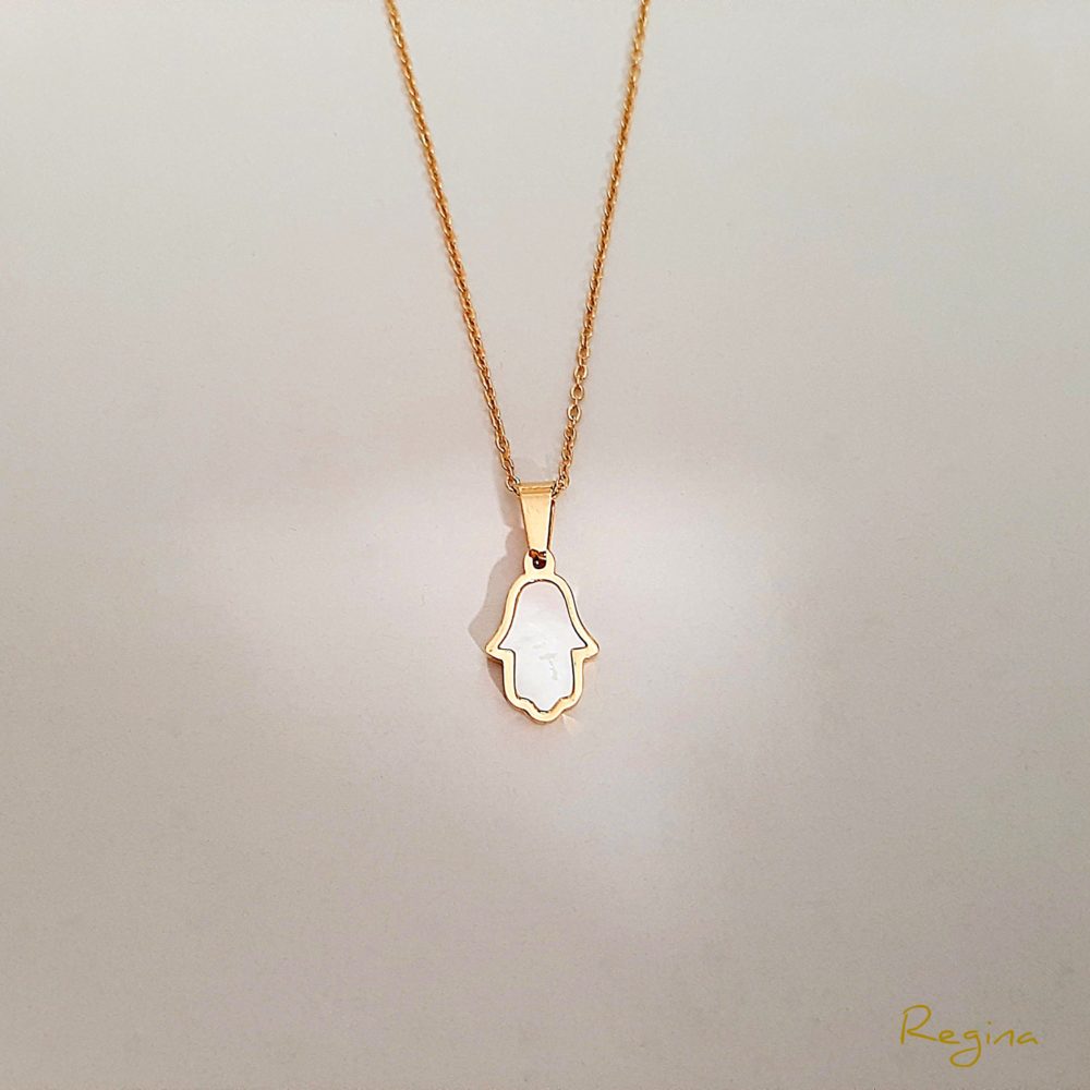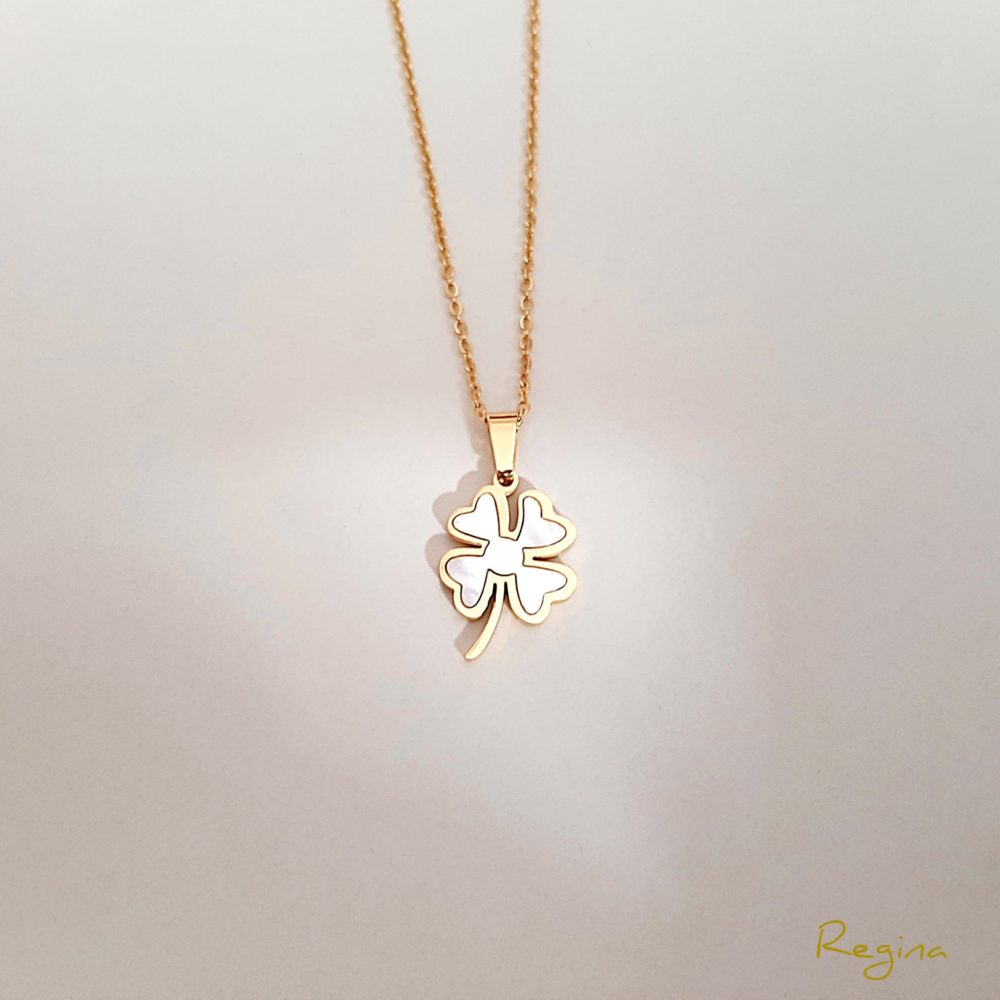 *Collar con cadena de 45cm/1.5mm y dije de acero 316L chapado en oro 18k con detalles en nácar natural.