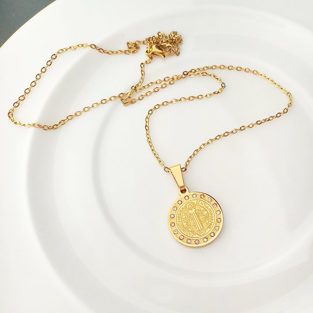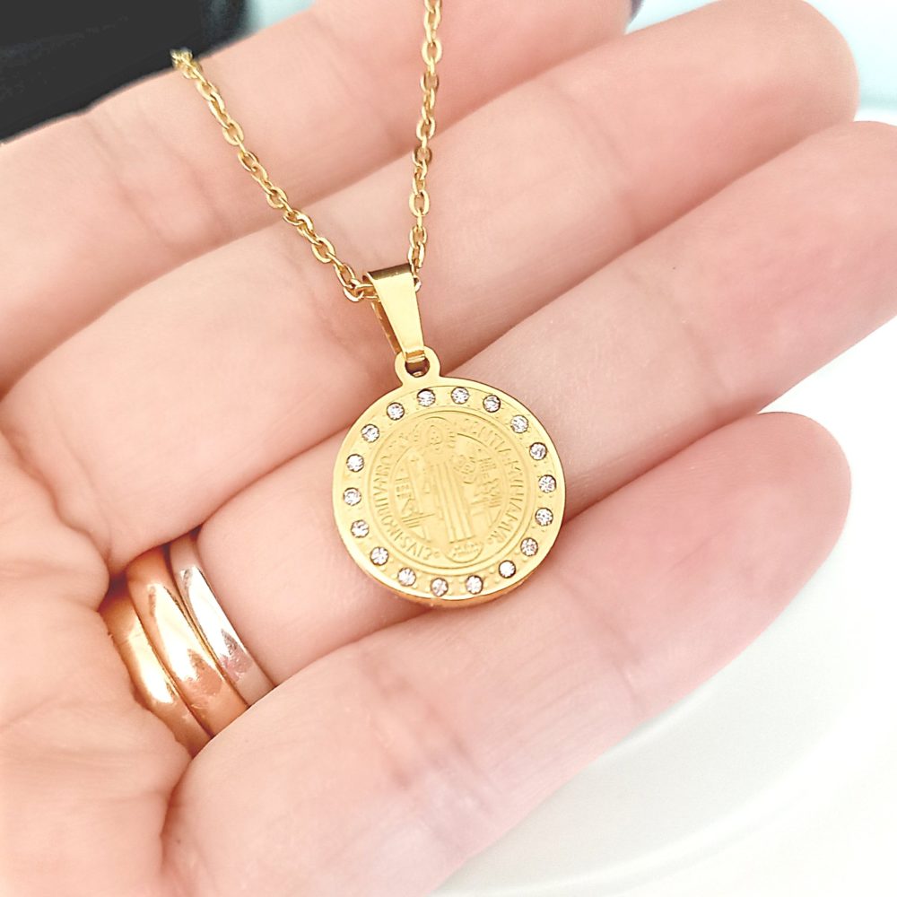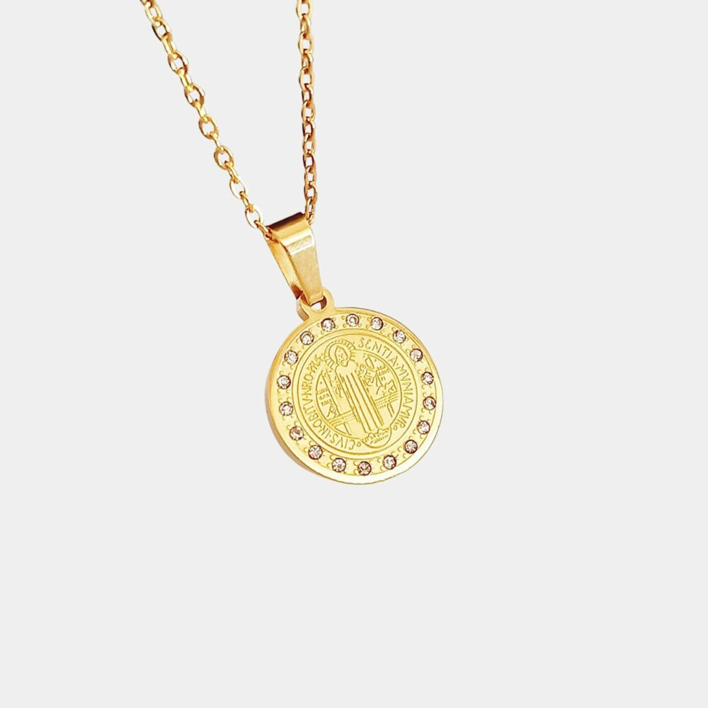 Collar protector con medalla de San Benito en un lindo diseño con circonias.