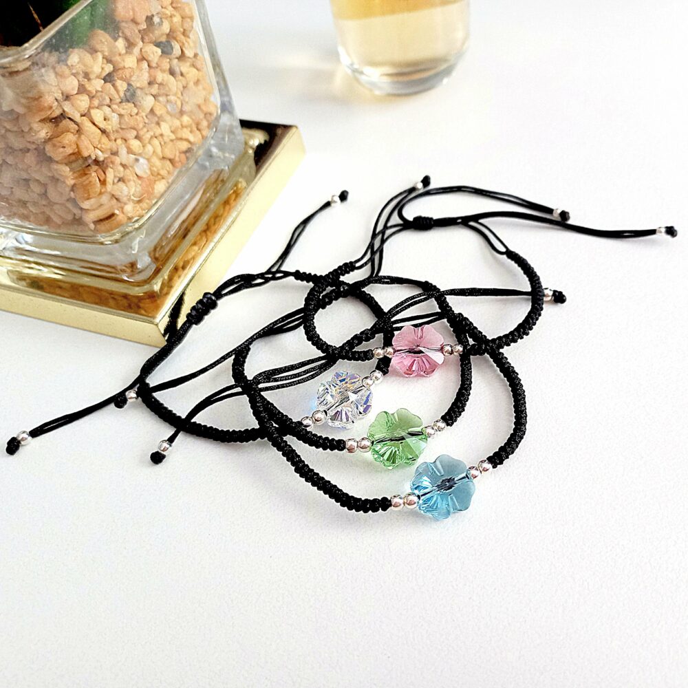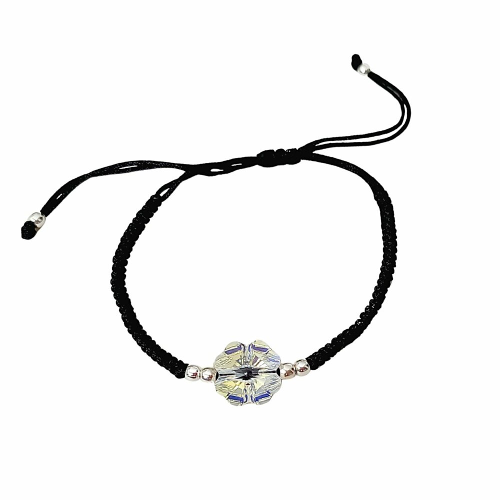 Material: Pulseras ajustables tejidas a mano, hechas en hilo, cristal austriaco Swarovski y plata 950.
