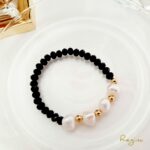 Material: Pulsera elástica artesanal hecha con murano negro facetado, acero chapado en oro 18k y perlas madre.