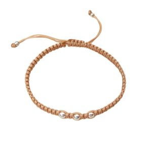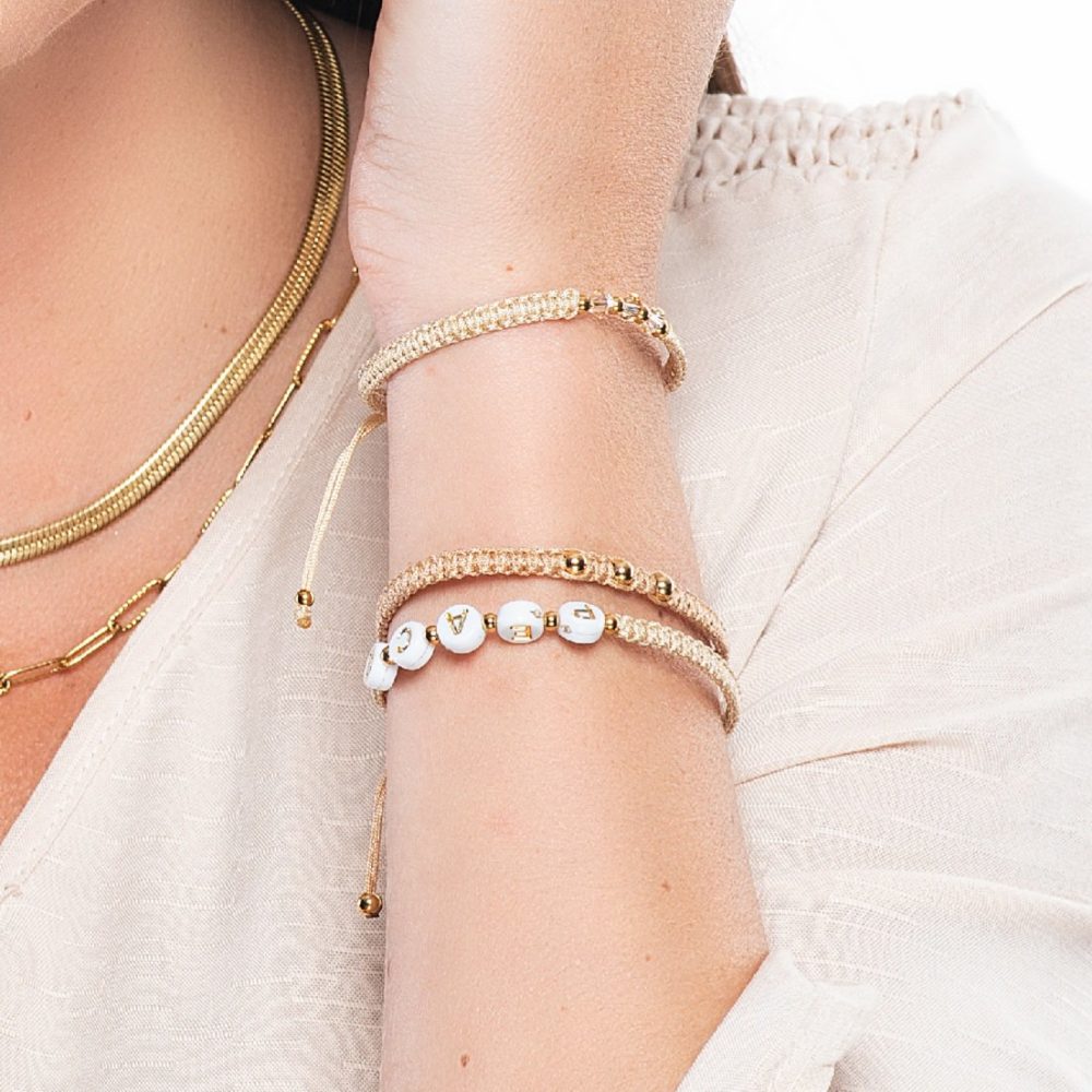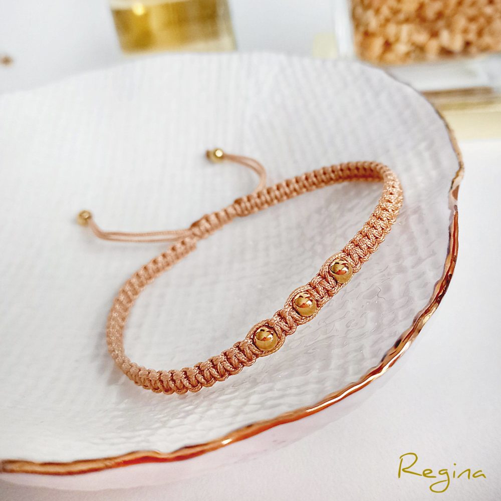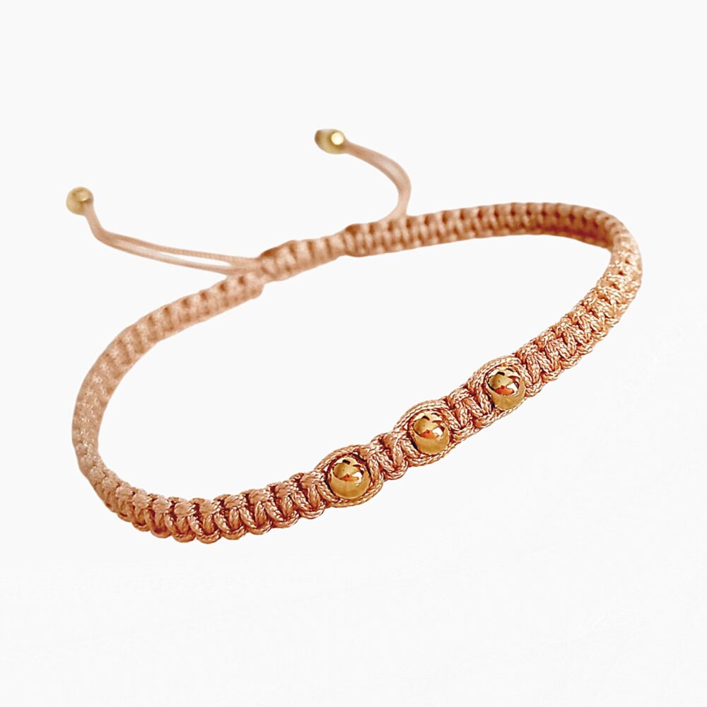 *Pulsera tejida a mano en punto macramé, con hilo color nude y accesorios de acero chapado en oro.