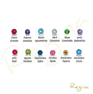 Enero – Granate ,Febrero – Amatista ,Marzo – Aguamarina ,Abril – Diamante (Cristal) ,Mayo – Esmeralda ,Junio – Alejandrita ,Julio – Rubí ,Agosto – Peridoto ,Septiembre – Zafiro ,Octubre – Turmalina ,Noviembre – Topacio ,Diciembre – Circón Azul |